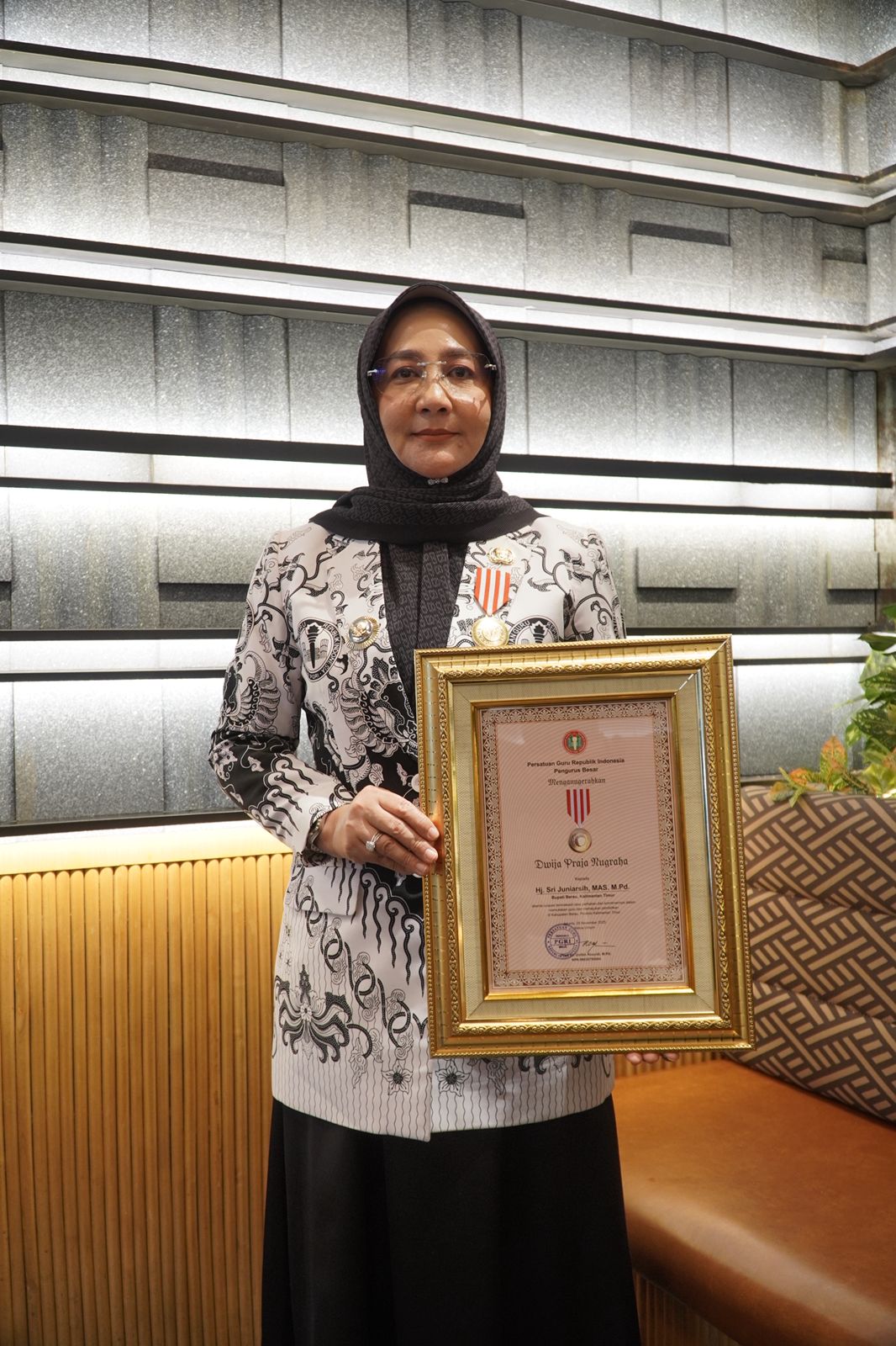 ARAHNUSANTARA, TANJUNG REDEB- Bupati Berau menerima penghargaan tertinggi saat perayaan Hari Persatuan Guru Republik Indonesia (PGRI) yang Ke-80 Tahun, yakni Djiwa Praja Nugraha yang berlangsung di Jakarta Sabtu (29/11/2025).